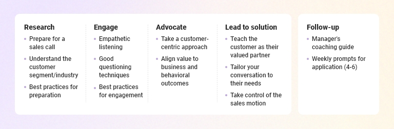 This approach is tailored to the target sales audience and their industry, market drivers and target customer profile, consisting of the following four phases of the learning journey: Research, Engage, Advocate for the Customer, and Lead to a Solution. Interactive conversations, hands-on activities, and scenario-based challenges enable participants to put their learning into practice, evaluate their comprehension, and prepare to apply their newfound skills in their upcoming sales calls.