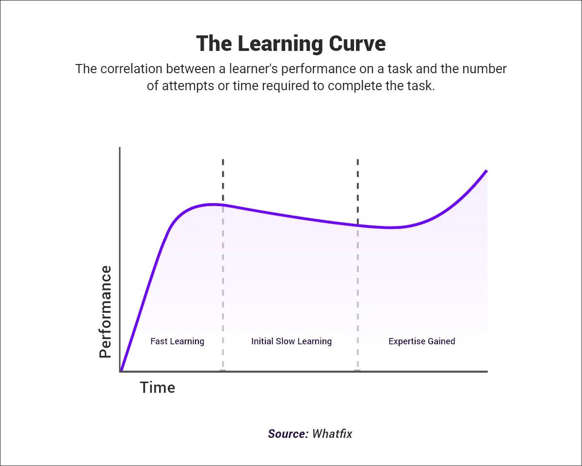 A learning curve evaluates the influence of training on employee performance. It serves as a strategic tool for identifying areas of improvement and designing training plans to enhance workplace productivity. Although commonly used in a colloquial sense to refer to the difficulty of learning new skills, the term ‘learning curve’ has a deeper significance. Most individuals have a steep incline to learn something new, which flattens as they learn the topic.