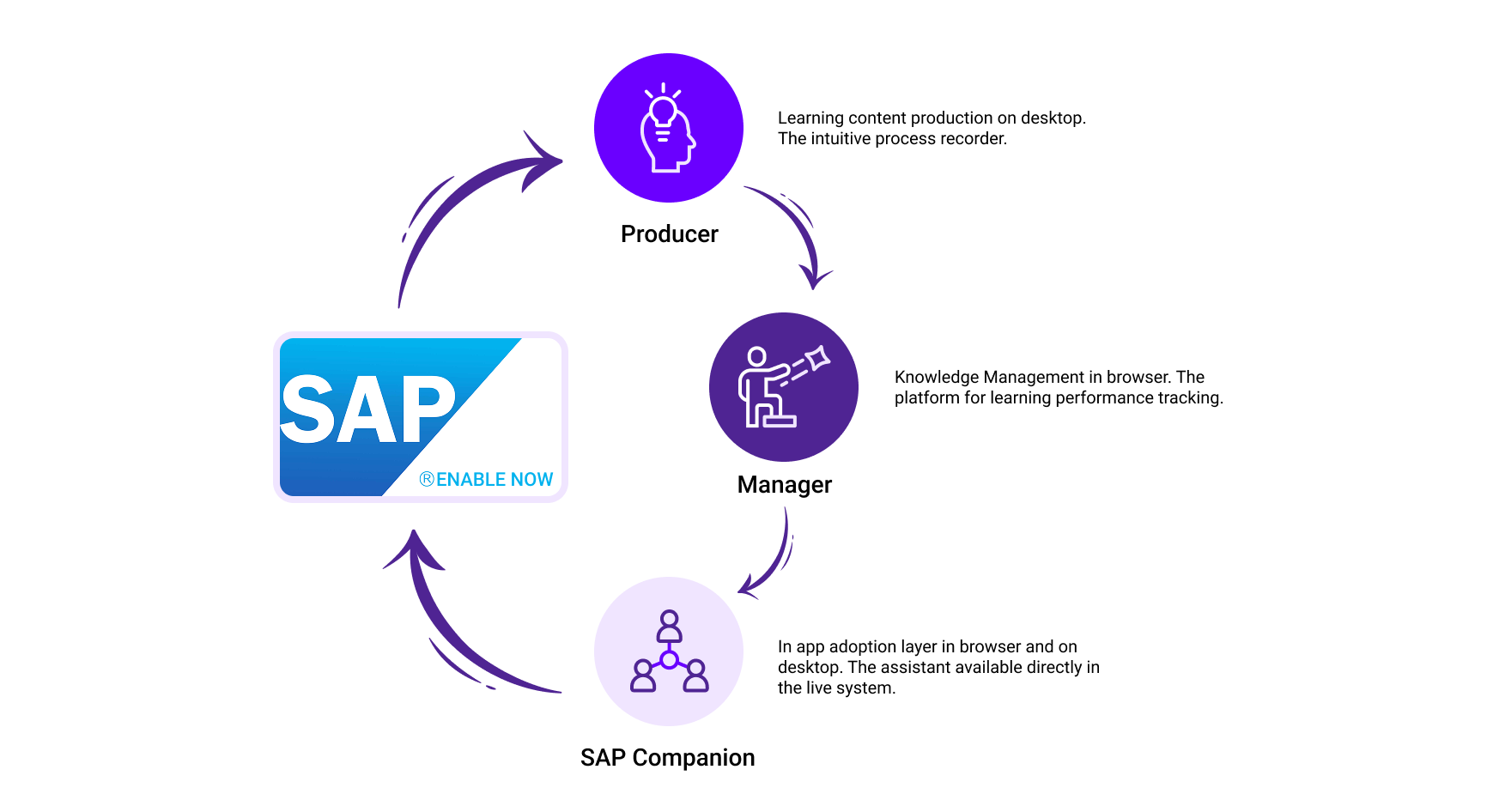 SAP Enable Now comprises three key components: SAP Companion, Manager, and Producer. SAP Companion provides real-time, interactive learning in web browsers and desktop applications for on-the-job guidance. Manager centralizes content like manuals and documents in the web browser, streamlining access to organizational knowledge. Producer enables the creation of simulations, exercises, standard operating procedures (SOPs), and workflow guides on desktops, supporting training and documentation.