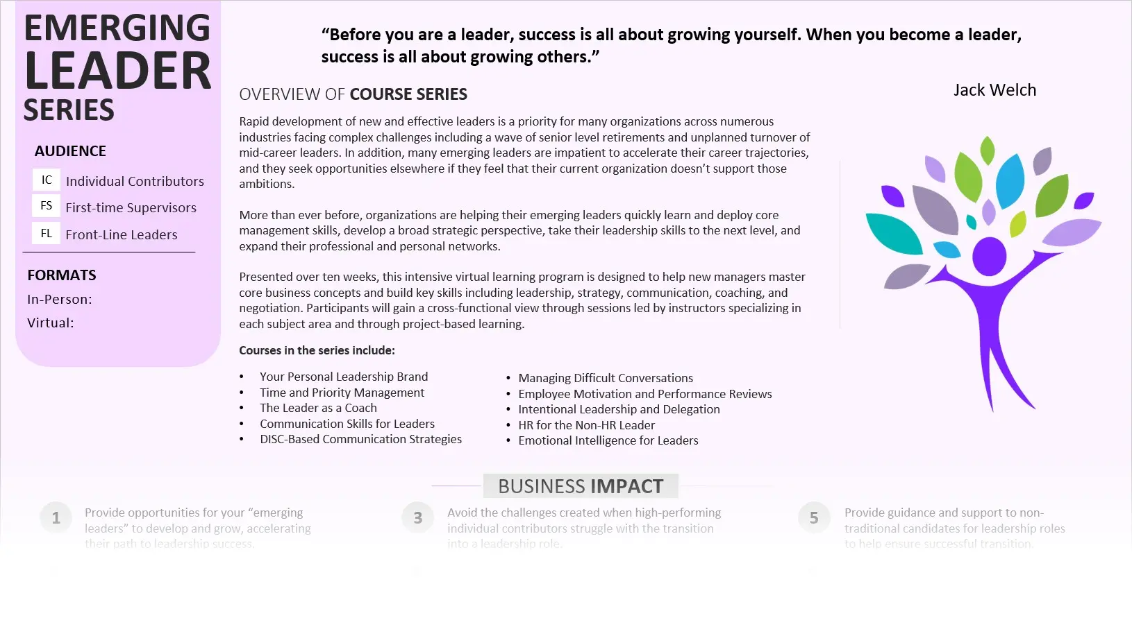 Quote The Emerging Leader Series has been transformative in my journey from individual contributor to a confident leader. It provided me with the essential tools to manage teams effectively and build a distinctive leadership brand. This program is invaluable for anyone aspiring to accelerate their leadership career trajectory . Quote
