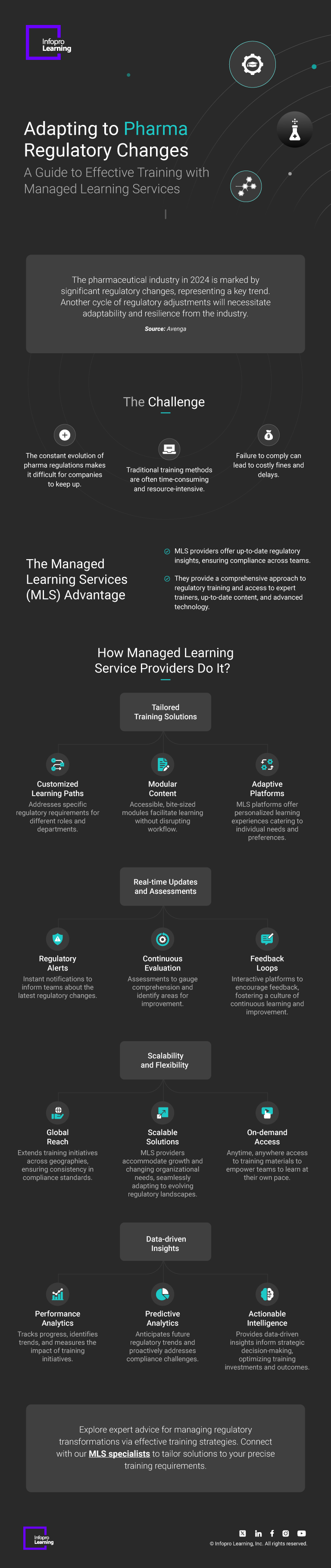 Managed Learning Services (MLS) provide the solution to effortless regulatory training. Customizable training content, diverse learning formats, expert-developed materials, and a streamlined platform – all managed for you. Reduce costs, boost efficiency, and enhance knowledge retention. View the infographic to see how MLS providers can revolutionize your pharma regulatory training.