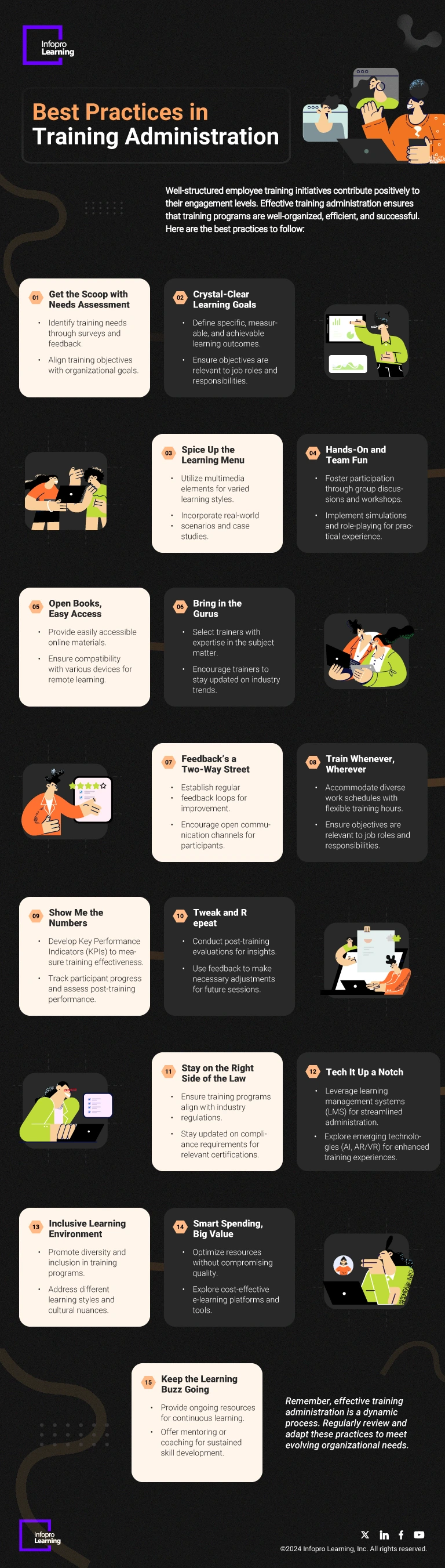 Effective training administration contributes to employees’ professional growth and enhances organizational performance by aligning workforce capabilities with strategic goals. It requires a blend of organizational skills, communication proficiency, and a strategic mindset to create a dynamic and impactful learning environment within the workplace. Check out the infographic for insights into best practices in training administration.