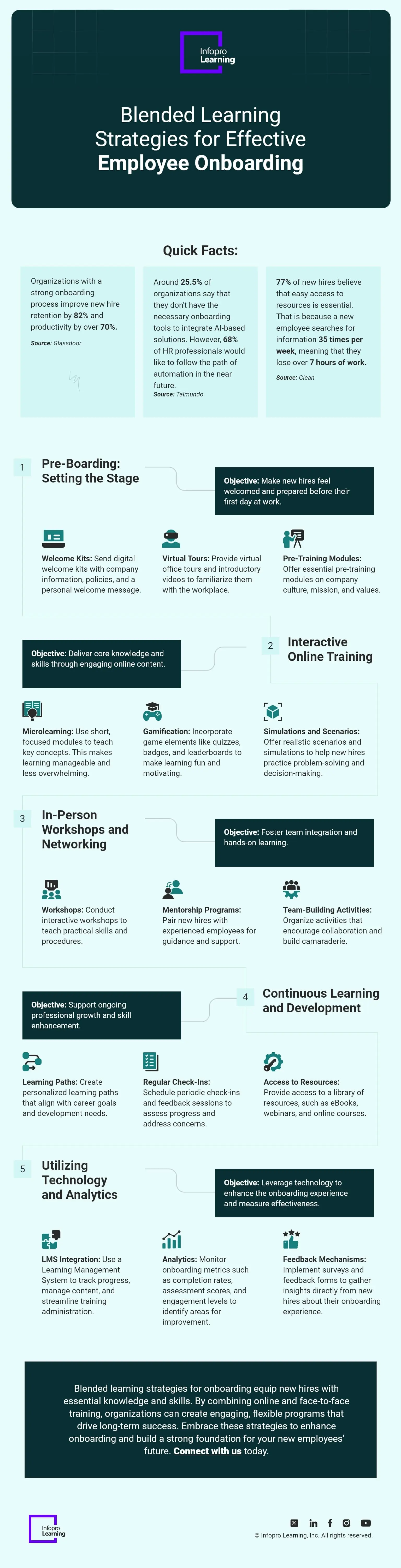 This infographic delves into how blended learning strategies can transform your onboarding process into a dynamic, engaging, and highly effective program.