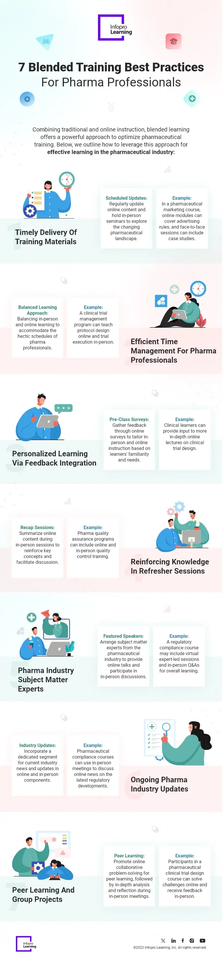 There are many benefits of blended training for pharma professionals, including flexibility, personalization, collaboration, and cost-effectiveness. Learners can access online content at any time and from any location, choose the learning activities most relevant to their needs, interact with their peers and instructors online, and save money on training costs. By following the best practices given in the infographic, you can create an effective, efficient, and engaging blended training program.