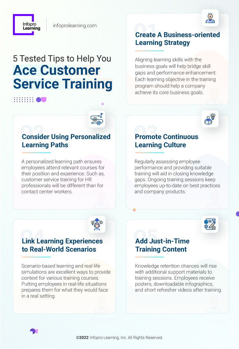 The key to success is to provide better learning experiences throughout customer service training sessions. Effective customer service training educates support representatives on delivering excellent customer service. This infographic has included five tips for improving an organization’s customer service training program.