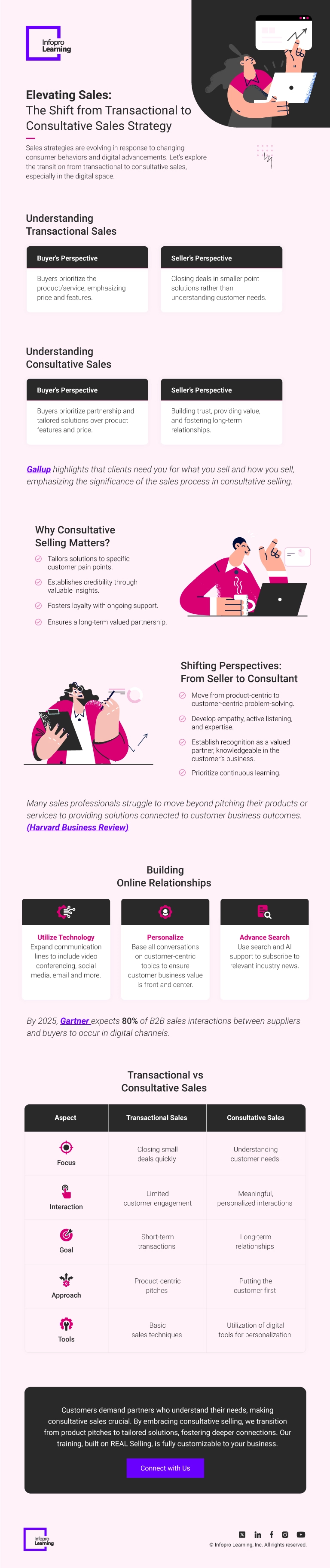 The infographic below delves into the transformative journey from transactional to consultative sales, exploring the pivotal role of technology in forging deeper connections and driving sustainable success in today’s dynamic marketplace.