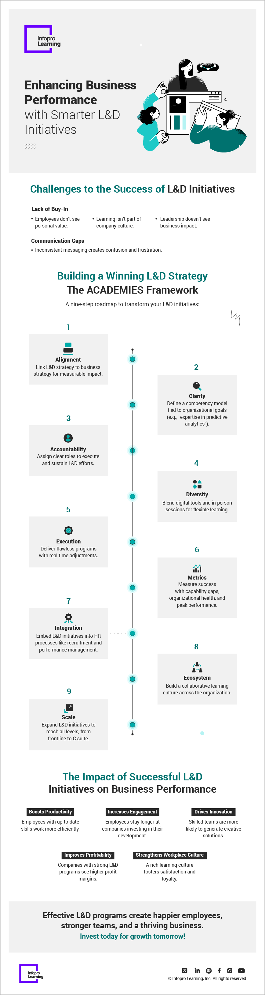 The best businesses thrive when their teams do in today’s fast-paced business world. L&D initiatives are the backbone of a high-performing organization through learning and development innovation. From greater efficiency to increased adaptability and innovation, strategically developed L&D programs provide benefits that reach every part of your organization. Discover how an employee development priority can drive individual skill sets, business success, competitiveness and sustainability from the infographic below.