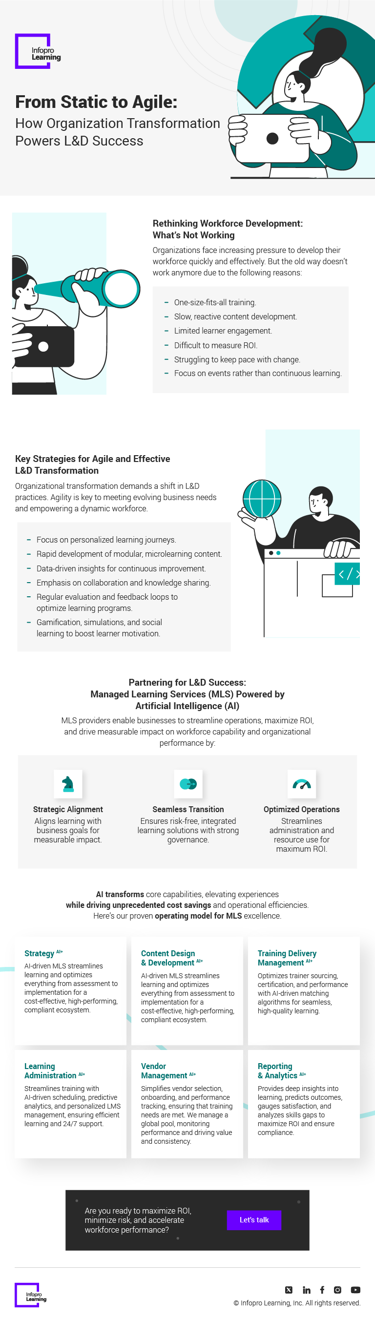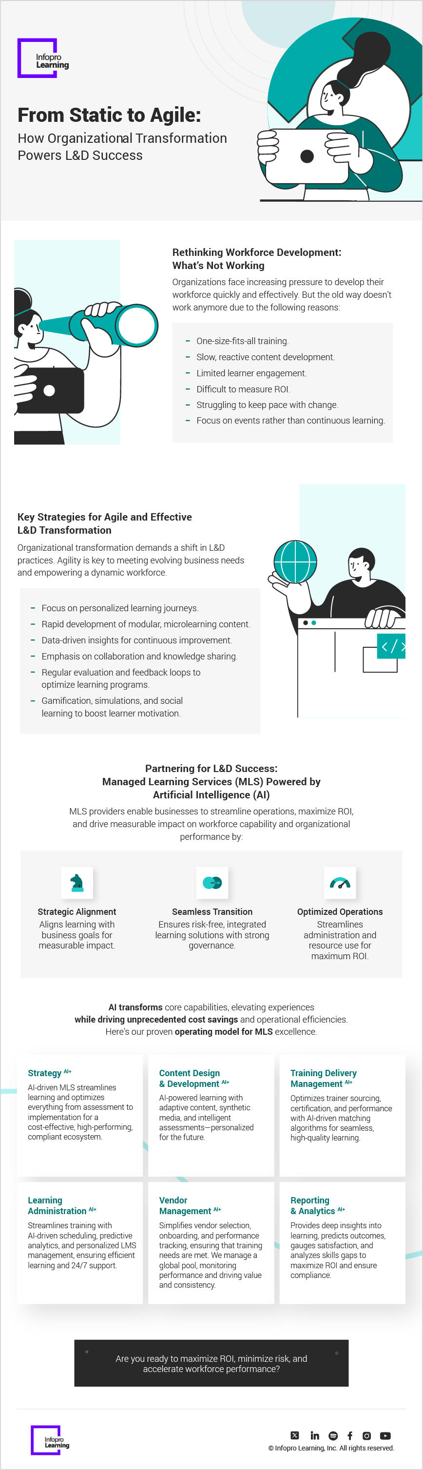 Today, organizations experiencing change are realizing the need for innovative and agile Learning and Development (L&D) strategies. Outdated classroom styles and one-time training methods are not equipped to provide the knowledge, and skills employees need to succeed. As the focus has shifted, so has the need for managed learning service providers that can move an organization away from legacy, event-based learning and towards vibrant, ongoing learning opportunities.