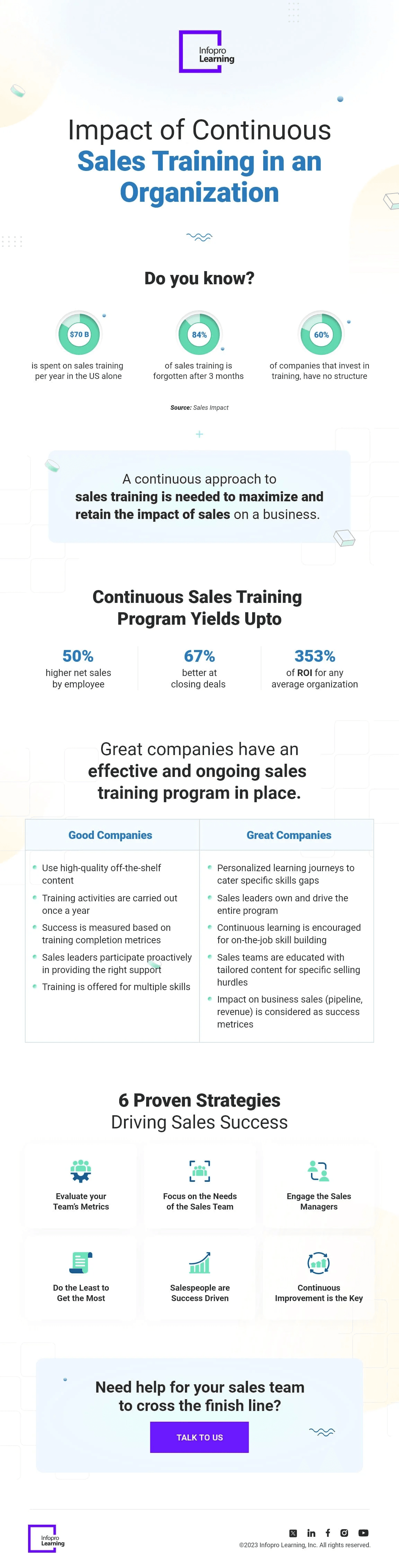 View the infographic below to discover why ongoing training is essential for sales professionals where you’ll find, the impact of sales training, the importance of continuous training, and six proven sales strategies.