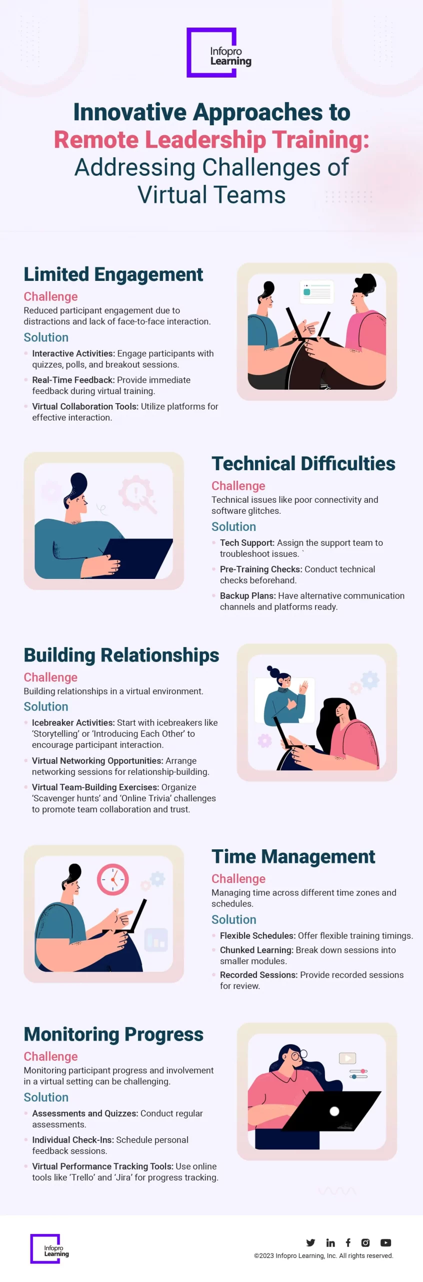 Are you facing challenges with leading virtual teams? Understanding the unique challenges of managing remote teams and their impact on participant engagement, technical issues, relationship building, time management, and progress monitoring. But worry not! We have effective solutions to address these challenges and help you thrive in the virtual environment. The infographic below discusses some innovative approaches to remote leadership training that can help address virtual team challenges.