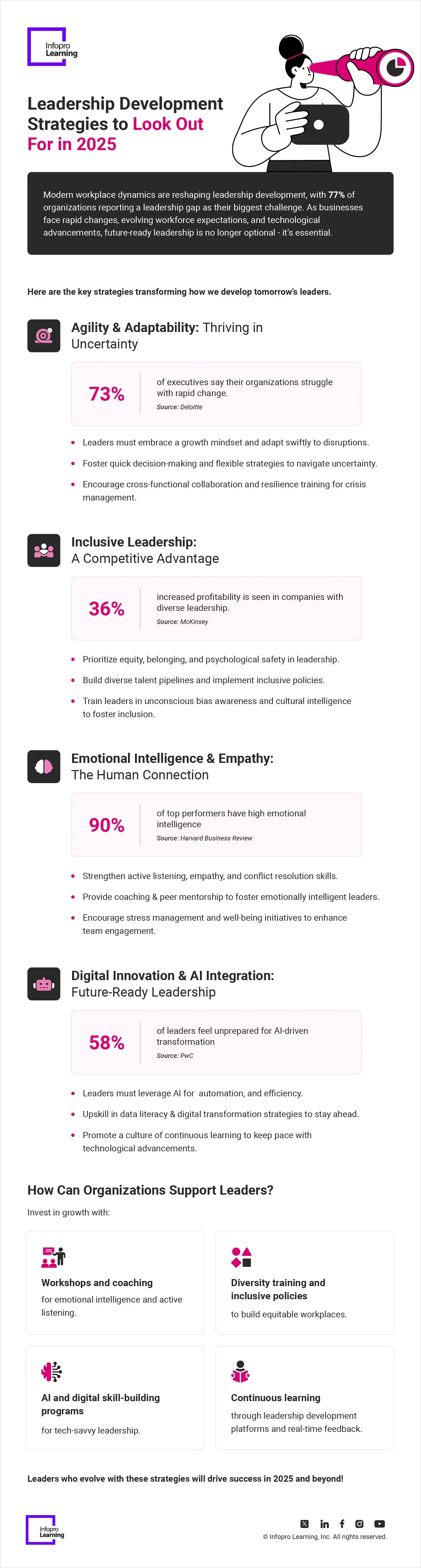 Discover the top leadership development strategies that will shape the future of business. Download our exclusive infographic to gain insights, real-world statistics, and actionable steps to build stronger, future-ready leaders.