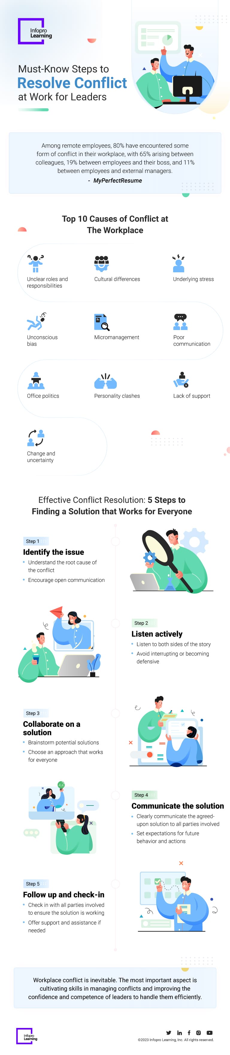Our infographic on workplace conflict offers valuable insights into the root causes of conflicts at work and outlines a five-step approach for leaders to resolve conflicts effectively.