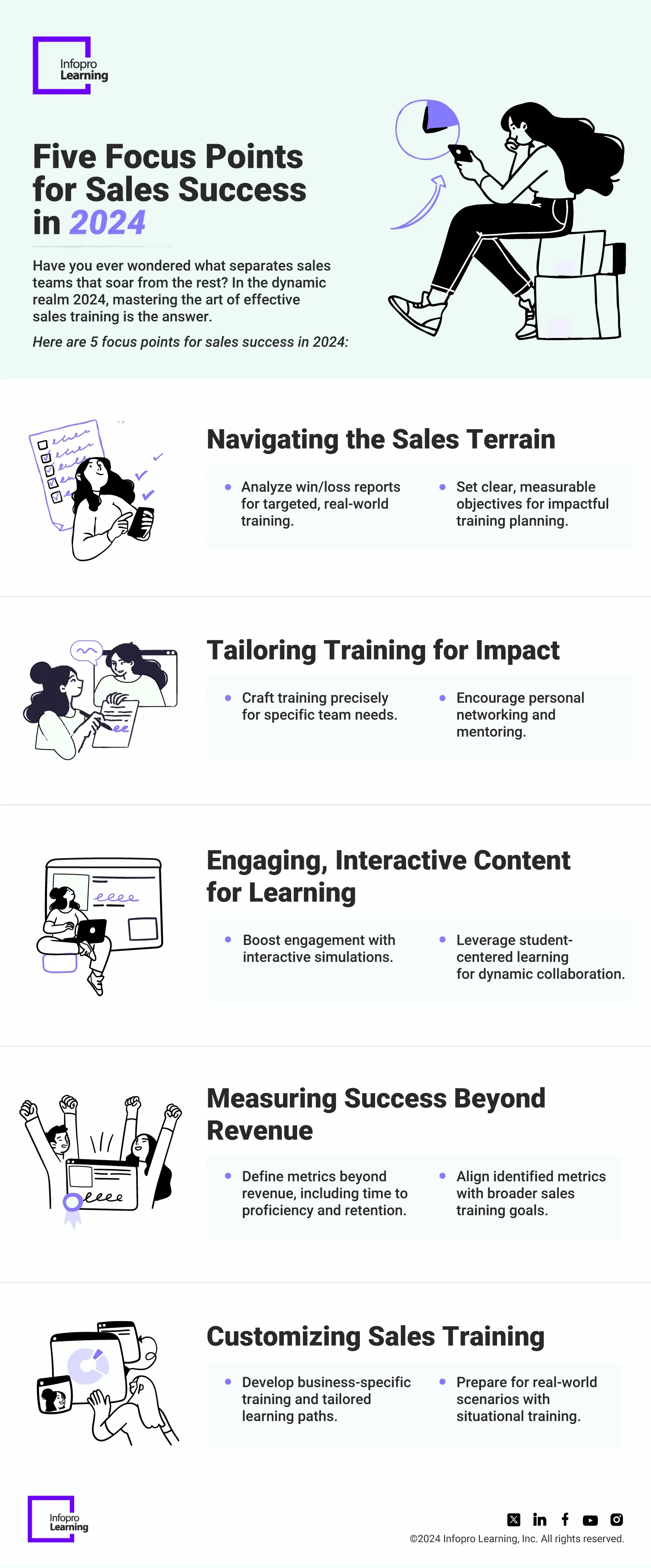 Embark on an insightful expedition with our latest infographic, “Five Focus Points for Success Sales in 2024.” Within its digital confines, discover five essential strategies meticulously designed to navigate the intricacies of contemporary sales. From targeted training insights to the art of crafting impactful sessions and the seamless integration of cutting-edge tech, this infographic unveils the keys to propel your team into the forefront of the ever-evolving sales landscape.