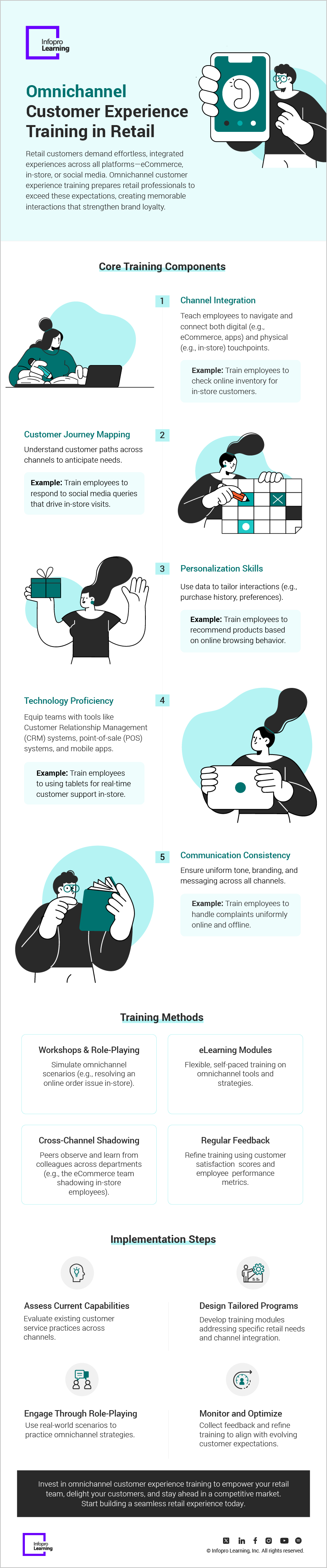Retail success today hinges on seamless, connected journeys. Customer experience training prepares your team to optimize the overall customer experience, ensuring personalization, channel integration, and continuous communication. Actionable learning techniques—such as workshops, eLearning, and real-time role-playing—help your teams deliver compelling experiences that foster loyalty and increase the bottom line. View the infographic below to create better customer experiences.