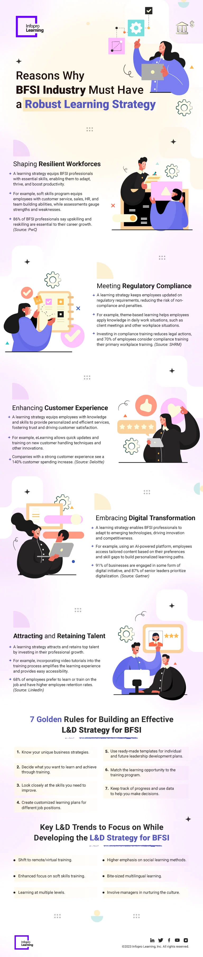 A robust learning strategy can help BFSI organizations stay ahead of the competition, comply with regulations, improve customer service, and reduce risk. It can also make employees more involved and happier, help the company retain more employees, make the work more efficient, help develop new ideas, make better choices, and spend less money.