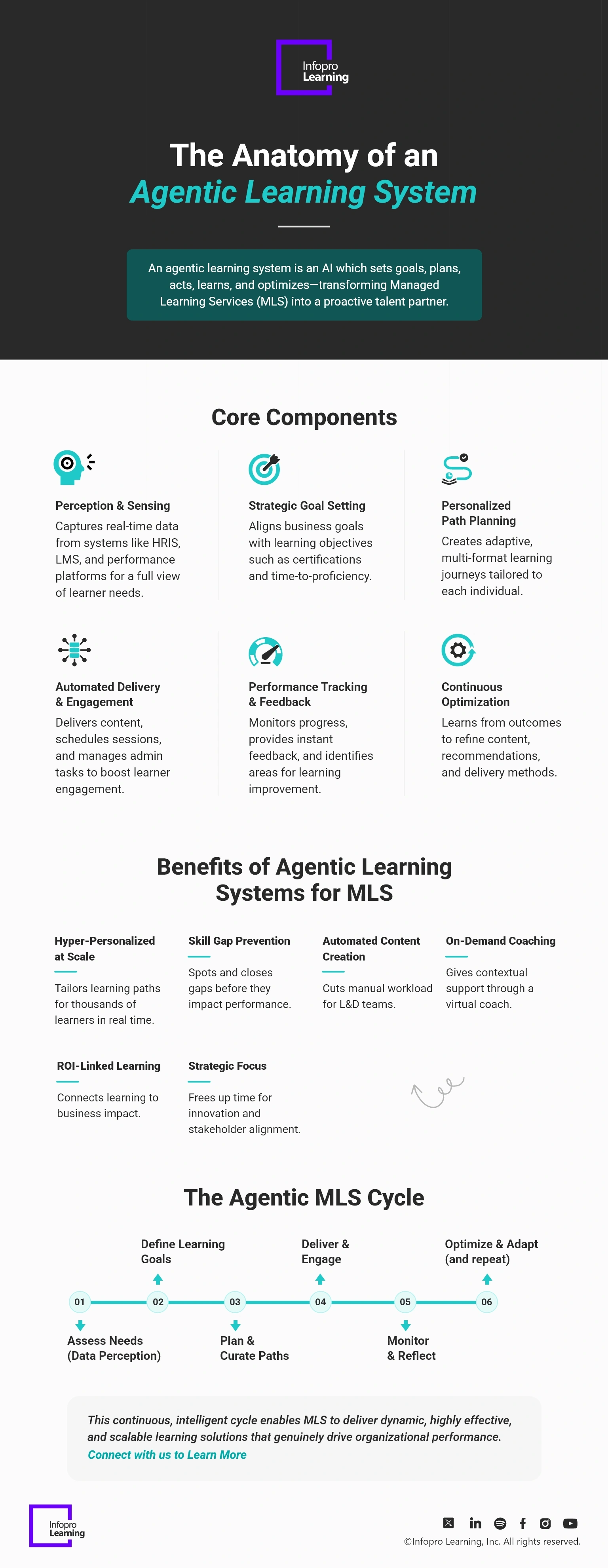 Is your organization’s learning strategy truly effective? Traditional methods often fall short in today’s dynamic environment. Agentic learning systems represent an intelligent evolution in an AI-powered framework that autonomously designs, delivers, and optimizes learning. Imagine a system that proactively identifies skill gaps, crafts personalized learning journeys, and continuously refines its approach to maximize impact. The infographic below reveals how an agentic learning system drives hyper-personalization, enhances efficiency, and delivers measurable ROI.