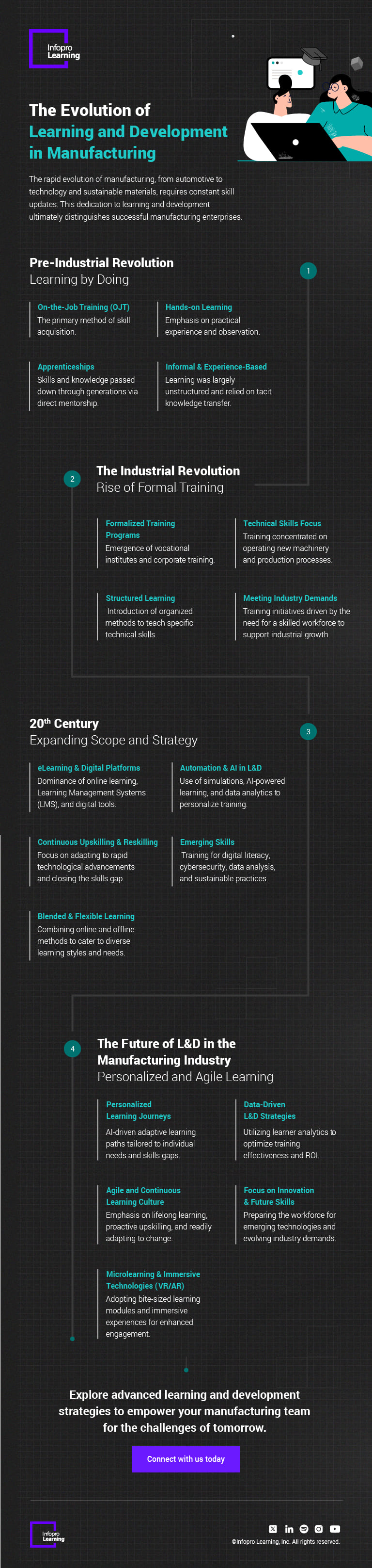 At the intersection of workforce capabilities and technological innovation, manufacturing enterprises can prepare to evolve as the industry evolves while transferring the confidence of agility. A roadmap of the history of technology training and skills for the future, from apprenticeship through artificial intelligence. View the infographic below for more insights.