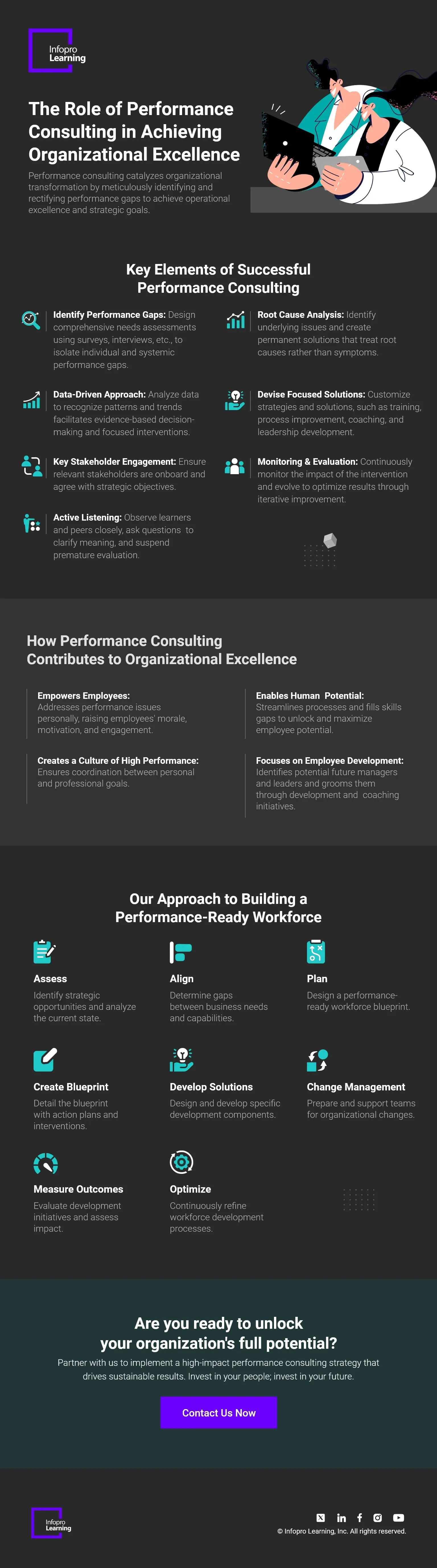 Are you struggling to close the gap between your current performance and strategic objectives? Performance consulting is a high-impact intervention that brings about organizational change by identifying and resolving performance problems. Our proven eight-step performance consulting process guarantees sustainable results from assessment through alignment, optimal performance, and measurement. The infographic below explains how our data-driven approach and targeted interventions involving other stakeholders can empower employees, unlock human potential and help establish high-performing cultures.