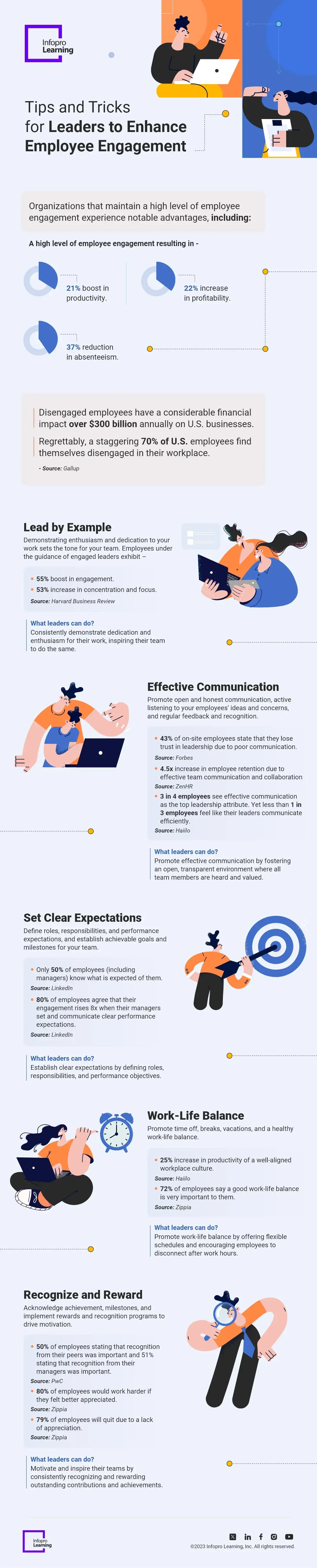 This infographic provides valuable tips and tricks for leaders to enhance employee engagement. Whether you’re a seasoned executive or a first-time manager, these strategies will help you build a highly engaged and motivated team. By implementing these practices, you’ll boost productivity and retention and create a workplace where employees thrive.