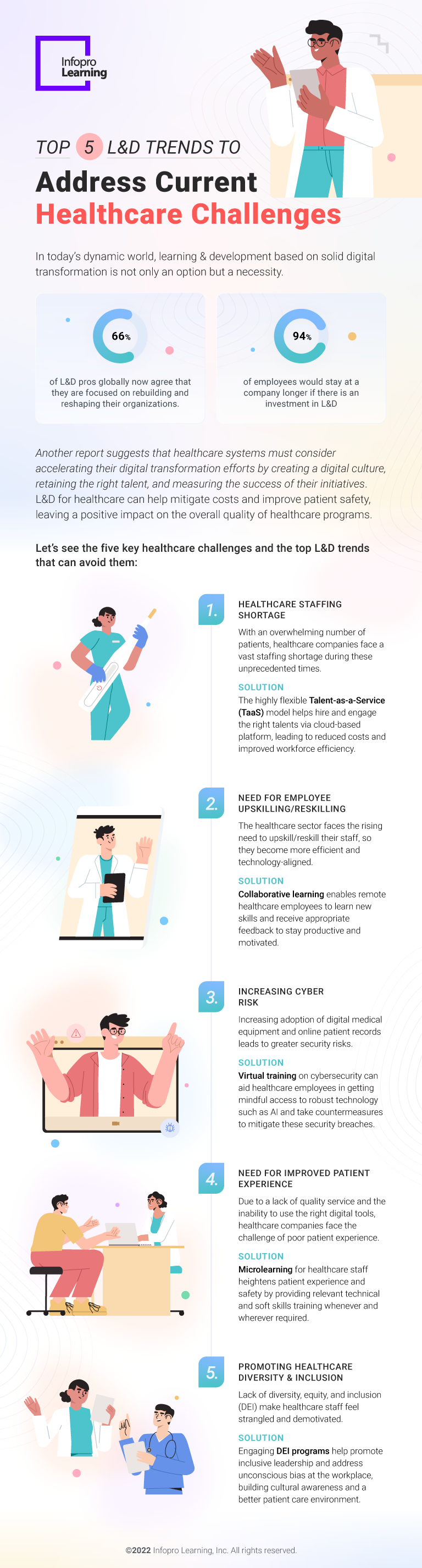 Learning and Development can be successfully leveraged in 2022 and even beyond to address various Healthcare challenges such as staff shortage, cyber risks, patient safety, and more. As per a recent report, healthcare systems can improve their digital transformation efforts by embracing a digital work culture and measuring success of their initiatives [1].