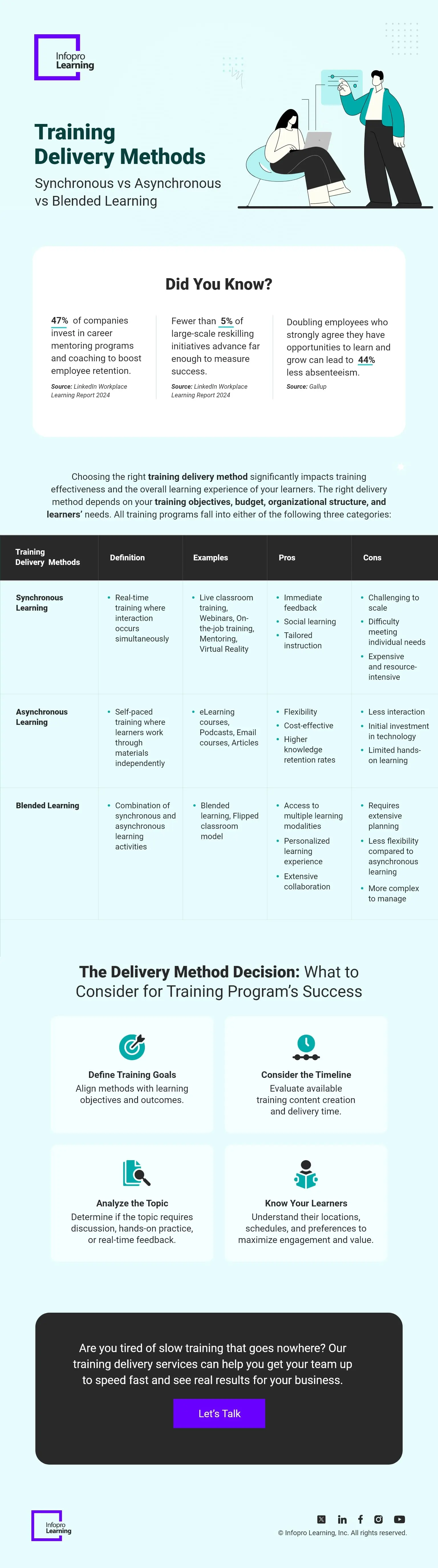 This infographic breaks down the training delivery methods into three main categories: synchronous learning, asynchronous learning, and blended learning. Compare each method’s pros and cons to find out which best fits your business. Let’s dive into the best ways to engage and empower your employees while ensuring they gain the skills needed in the most effective manner possible.