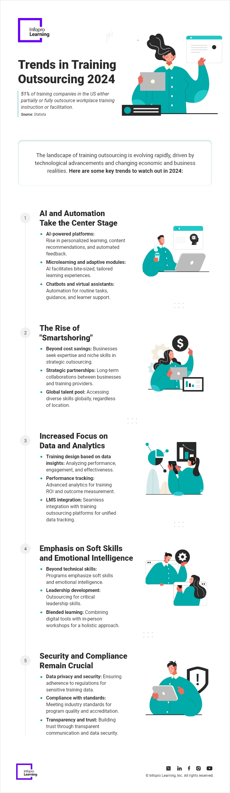 This allows organizations to focus on core capabilities while ensuring that employees receive the most effective training possible. ‘Trends in Training Outsourcing 2024’ infographic reveals the top 5 trends you need to know for effective training outsourcing.