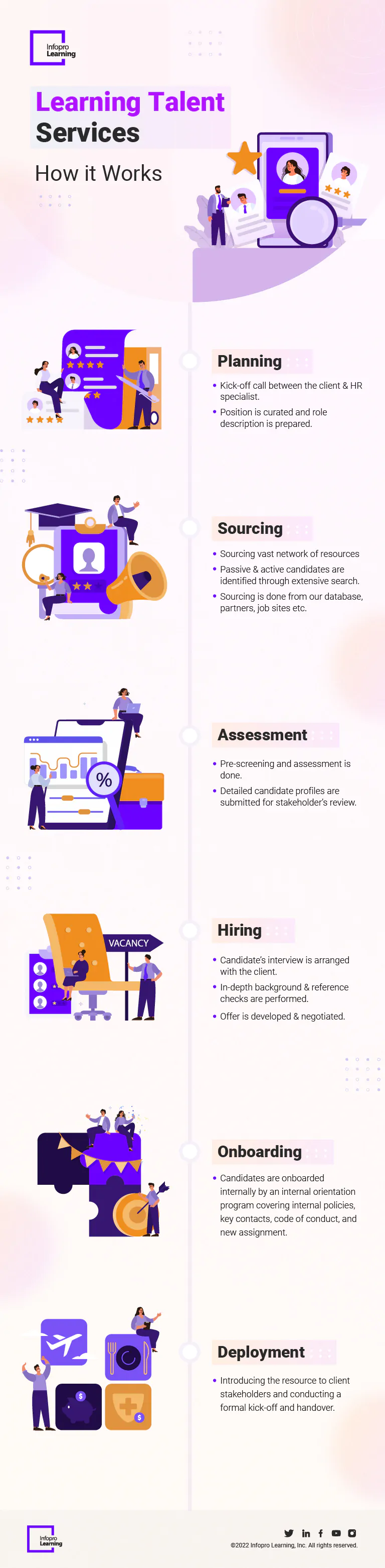 Learning Talent Services offers a viable solution, allowing organizations to increase or decrease headcount as per their requirements without affecting the overall operations. It also helps organizations engage experts and specialists for their pertinent training requirements. Infopro Learning’s Learning Talent Services is a comprehensive solution that allows organizations to customize their hiring needs without going through traditional hiring methods. It provides them access to top L&D talent that can be deployed instantly across the globe. The end-to-end solution takes care of resource planning, sourcing, assessment/screening, deployment, onboarding and hiring – saving valuable time and helping organizations focus on their core objectives.