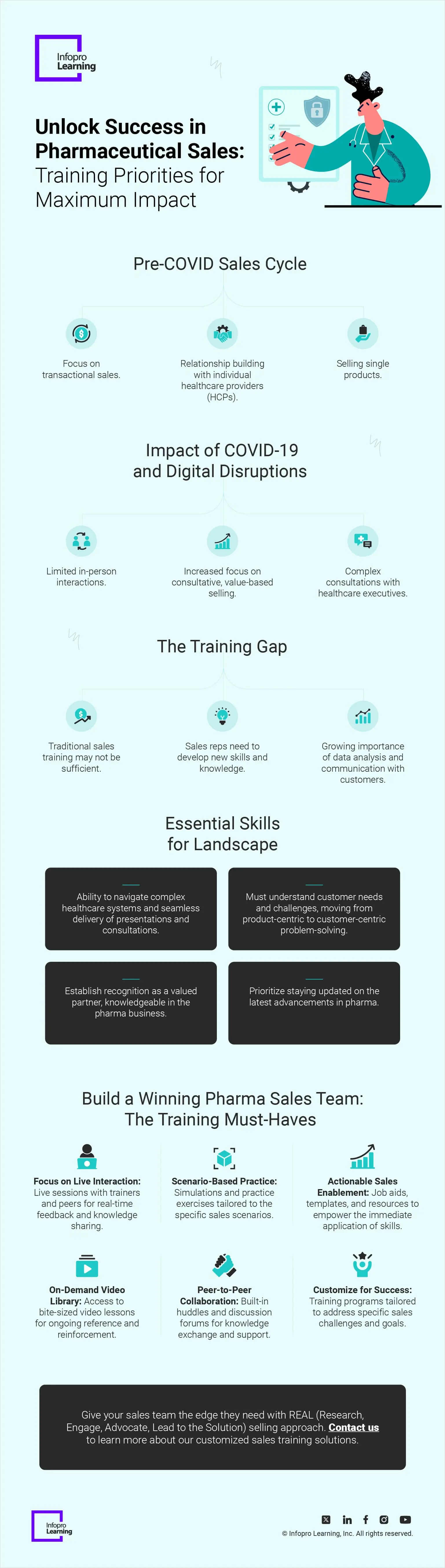 Success in pharmaceutical sales demands a unique blend of skills, in-depth product knowledge, and a commitment to ethical practices. Challenges like limited information, complex onboarding processes, evolving regulations, and reduced access to healthcare professionals create a demanding environment. Organizations must focus on a few key elements mentioned in the infographic below to overcome these challenges and build a winning sales team.