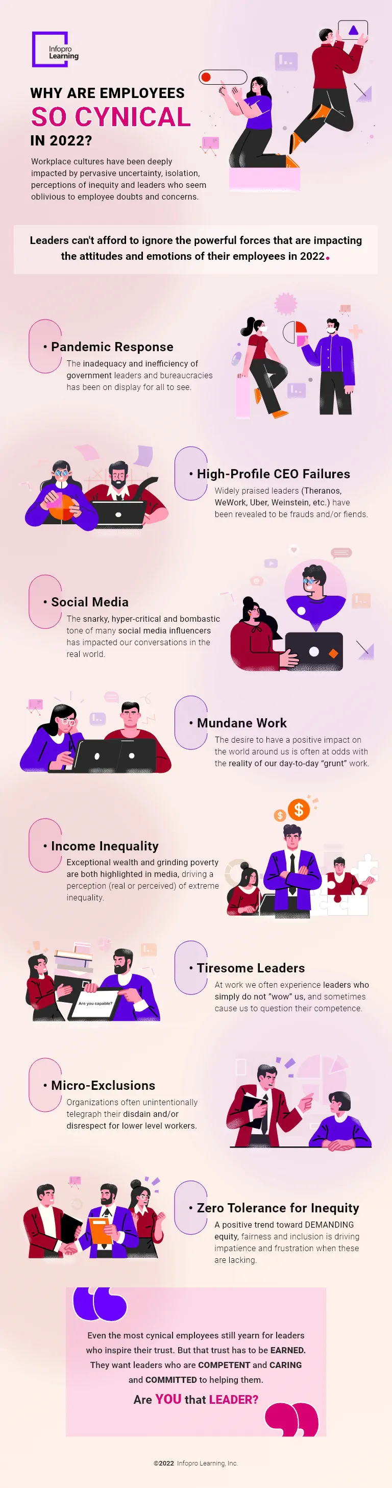 Over the last two years, workplace cultures have been deeply affected by isolation, inequity, and uncertainty. Powerful forces such as pandemic response, mundane work, micro-exclusions, tiresome leaders, and others have resulted in employee cynicism. Therefore, leaders need to be competent and committed to gaining the trust of even cynical employees.