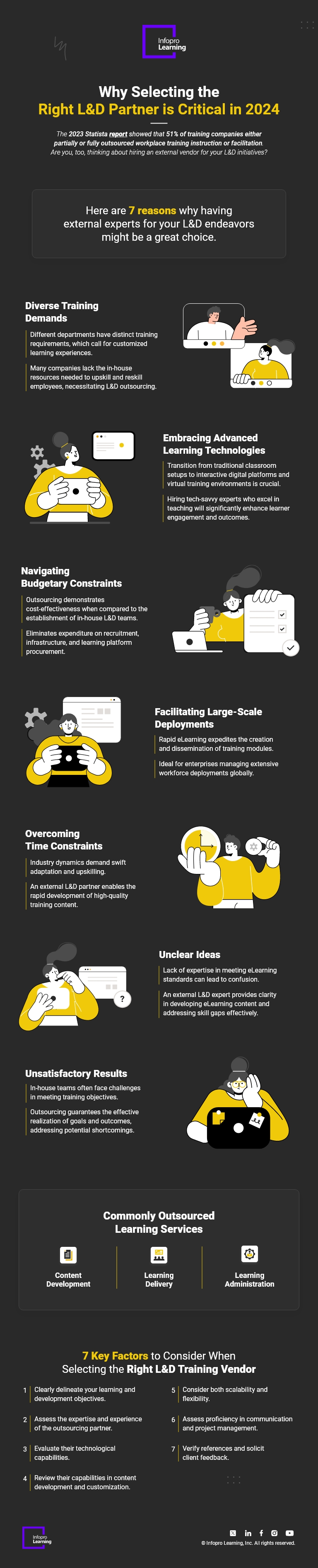 Customization and flexibility are critical factors; L&D programs should be tailored to align with the organization’s unique culture, goals, and industry-specific requirements, offering diverse delivery methods to accommodate different learning preferences. By selecting an L&D partner that excels in these areas, organizations can empower their employees to thrive amidst digital transformations, driving innovation and sustainable growth. View the infographic to learn about selecting the right L&D partner in 2024.