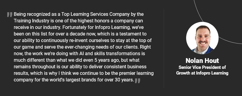 Infopro Learning is honored to be named one of the 2024 Top Learning Services Companies by the Training Industry. This prestigious recognition highlights Infopro Learning’s commitment to providing innovative and impactful learning solutions that empower organizations to unlock the full potential of their workforce.
