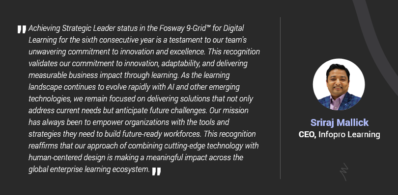 Infopro Learning has been recognized as a Strategic Leader in the prestigious 2025 Fosway 9-Grid™ for Digital Learning. This marks the sixth consecutive year of achieving this distinction, reinforcing Infopro Learning’s position as a premier provider of enterprise-scale digital learning solutions.