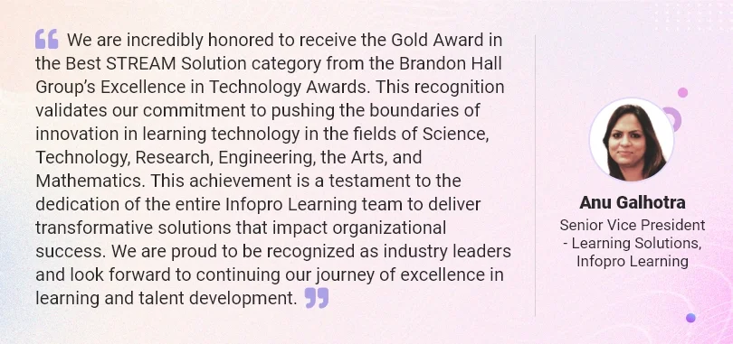 Commenting on the win, Anu Galhotra, Senior Vice President-Learning Solutions at Infopro Learning, expressed,
