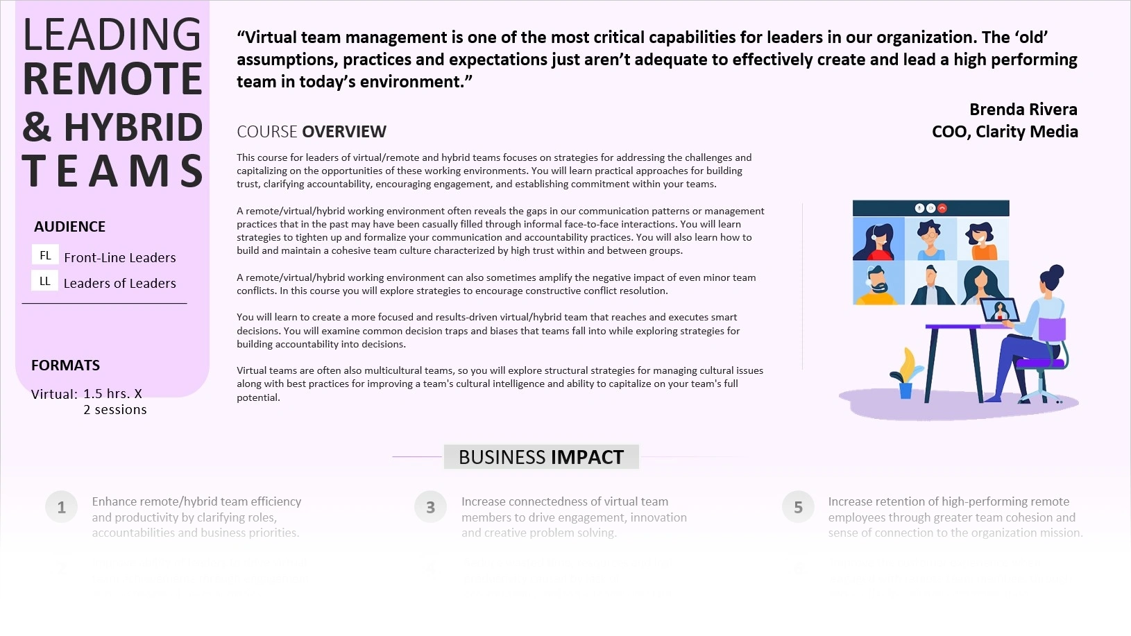 Sharpen leadership skills to unite and energize remote/hybrid teams, cross-cultural teams, multi-generational teams.